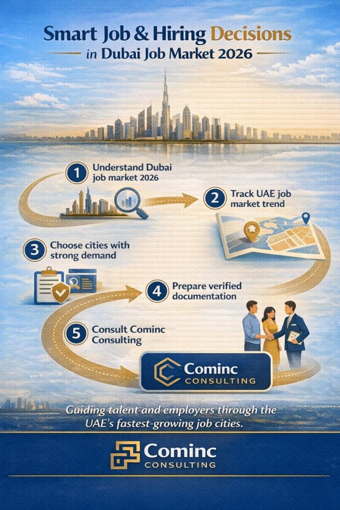 The Dubai job market for 2026 highlights a future defined by opportunity, structure, and accountability. Both employers and professionals must stay informed and prepared with evolving UAE job market trend insights, expanding Dubai employment opportunities, and competitive Abu Dhabi jobs 2026. This is where Cominc Consulting plays a vital role.