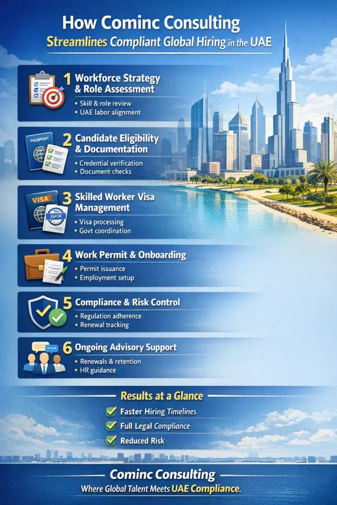 Dubai has turned into an international magnet for talent, drawing in professionals with skills from all over the world. For companies, tapping into this workforce can be a significant growth driver, but only if it is done properly and legally. This blog explains how to hire foreign workers in the UAE in a precise, lawful, and friendly-to-business manner while highlighting how Cominc Consulting can simplify the journey.